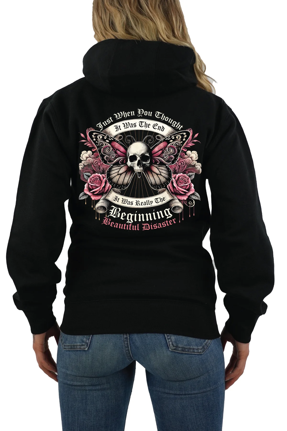 The Keep Going Pullover Hoodie is your wearable reminder that every ending can spark a new beginning. Featuring our striking butterfly and skull artwork surrounded by roses and the words “Just when you thought it was the end, it was really the beginning,” this hoodie is a symbol of transformation, strength, and rebirth.