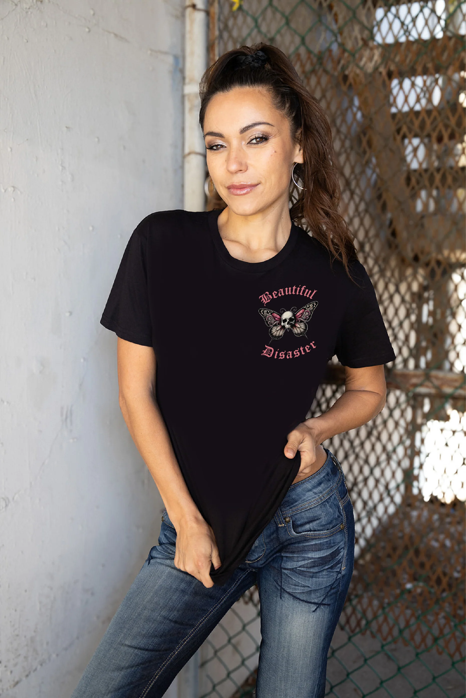 Made for comfort and confidence, this relaxed-fit tee feels like your old favorite from day one. The front features the Beautiful Disaster logo with the butterfly skull detail — a subtle reminder that you’ve been through it and you’re still rising.
