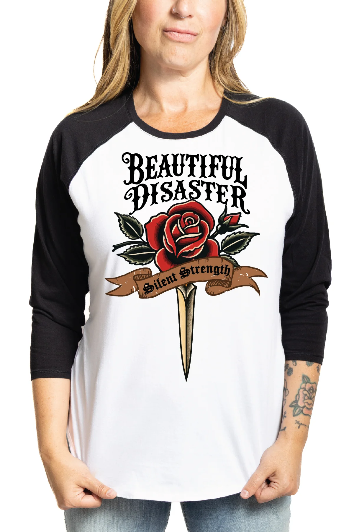Front and center, a dagger pierces through a rose wrapped in a banner that reads Silent Strength, with the Beautiful Disaster logo flying proud above it. The back features a vertical line of roses blooming up the spine—a beautiful reminder that growth often comes from pain.